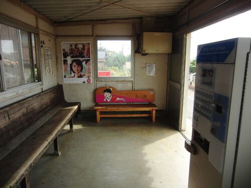 カニまつり(微妙に違う)のあとは、歩いて境港駅へ行って、河崎口駅まで移動。そして歩いてスタジアムへ。 サッカーの試合をみることも目的ですが、スタジアム自体を見てみたいという理由もありました。 河崎口駅待合室。ねこ娘ベンチ。ここから歩いてチュ…