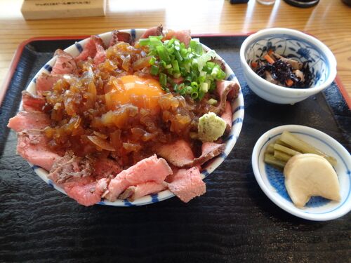 関英ドライブインに行ってきました。 お店は今日大晦日もお昼は営業。お疲れ様です。 ローストビーフ丼(1100円)。 今日の日替わり定食でした。 「本日はしっとり豚モモと特製オニオンソース!」って豚肉なの!? お肉の量すごい。茶色いものはオニオン…