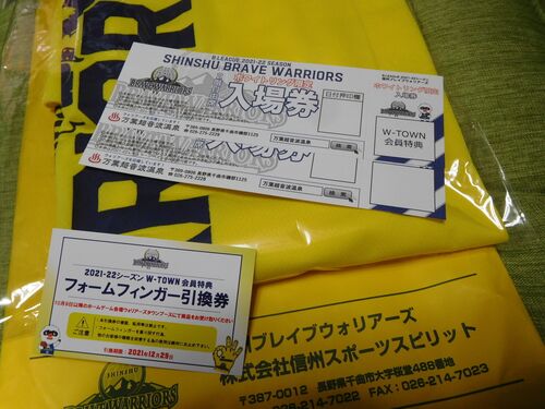 信州ブレイブウォリアーズの会員入会特典が届きました。 Tシャツと会員証と自由席入場券2枚。 今年の自由席券は、ホワイトリング限定。ことぶきアリーナ千曲では 使えません。昨シーズンは、自由席券でことぶきアリーナ千曲で入場したい 人が会場に来ると全…